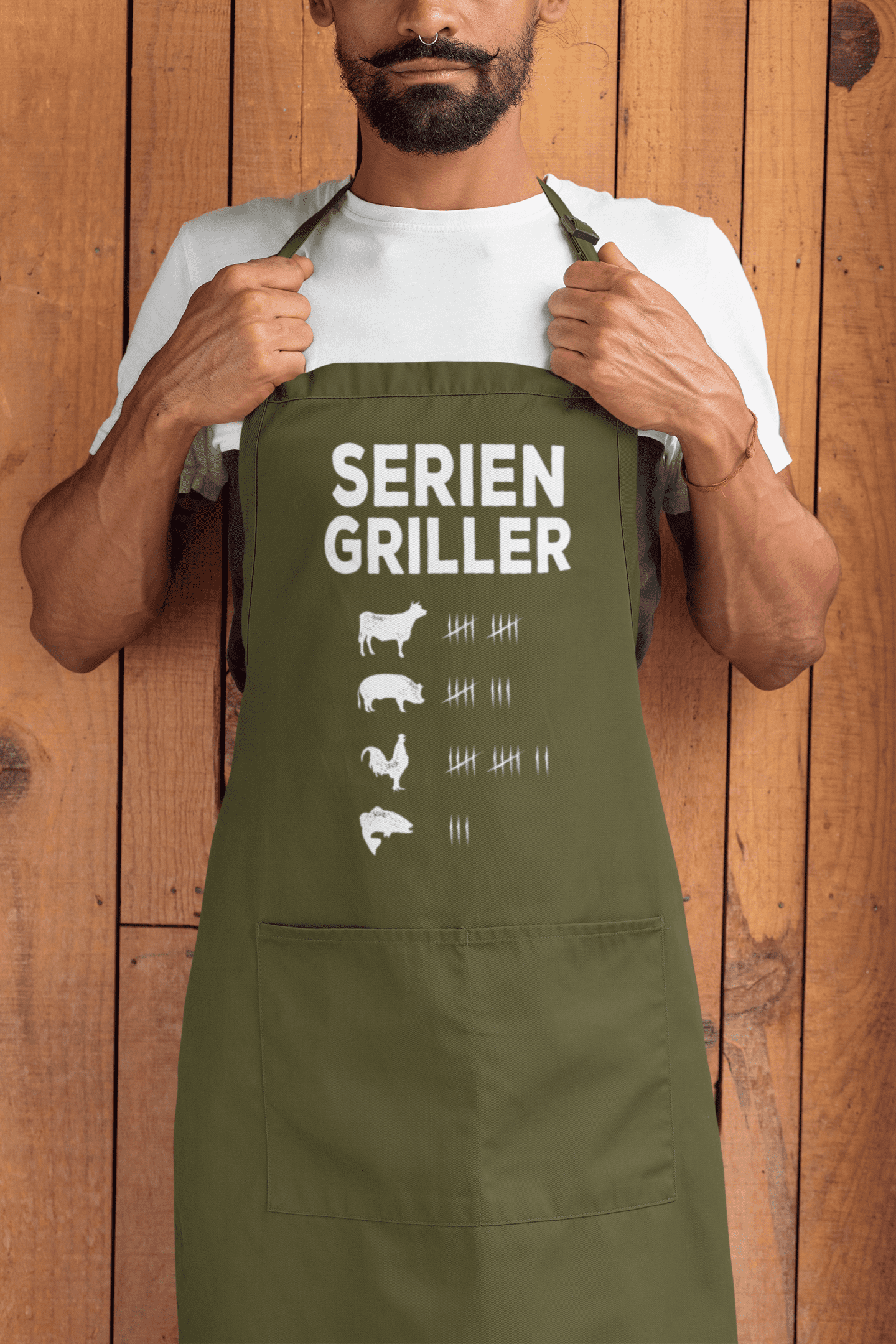 Der Schriftzug "Serien Griller" auf der Vorderseite der Schürze ist mehr als nur ein Spruch – es ist ein Lebensstil! Dieser Ausdruck steht für deine Leidenschaft fürs Grillen und deine Vorliebe für ausgedehnte Serienabende.