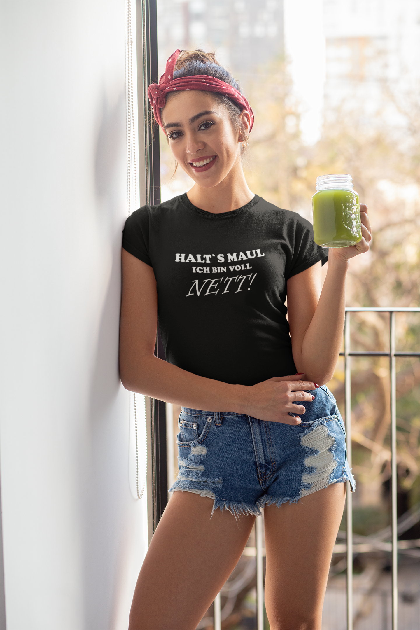 Selbstbewusstes Frauen T-Shirt mit dem Aufdruck "Halt's Maul, ich bin voll nett". Hochwertiges Shirt aus weichen und langlebigen Materialien für angenehmen Tragekomfort. Zeigen Sie Ihren charmanten und frechen Humor mit diesem klaren Statement. Verfügbar in verschiedenen Farbvarianten, leicht kombinierbar mit Jeans oder Shorts. Bestellen Sie jetzt und bringen Sie eine Prise Selbstbewusstsein und Humor in Ihren Look! Perfekt als Geschenk für sich selbst oder für Menschen, die Ihre starke Persönlichkeit schätzen.