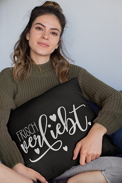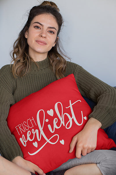- Kissenbezug mit dem verspielten Aufdruck "Frisch Verliebt".