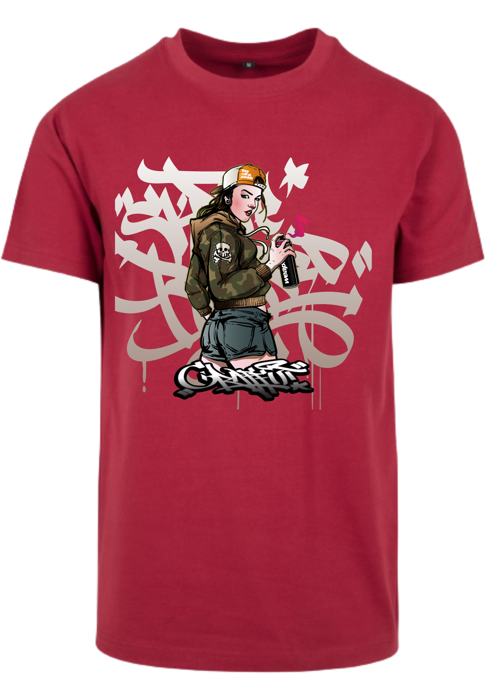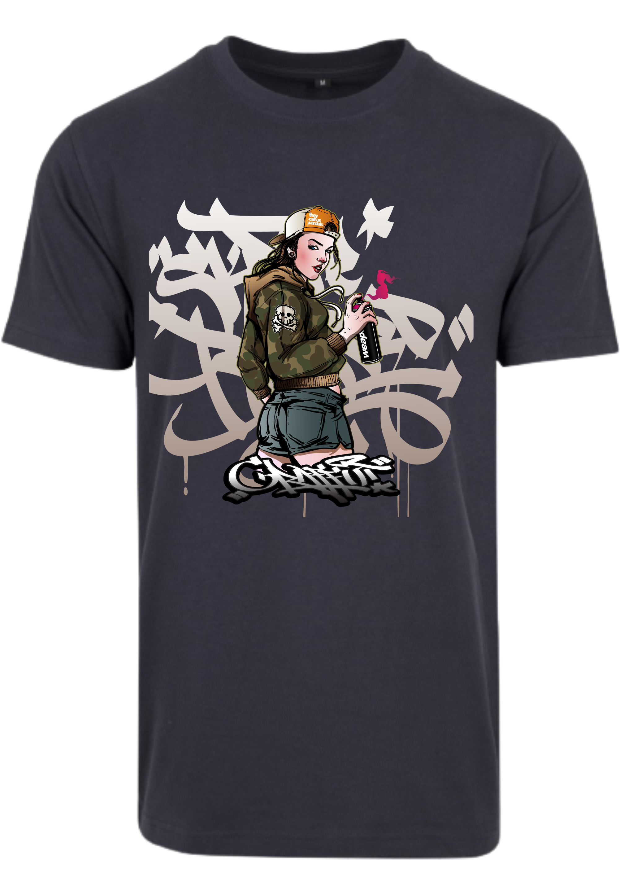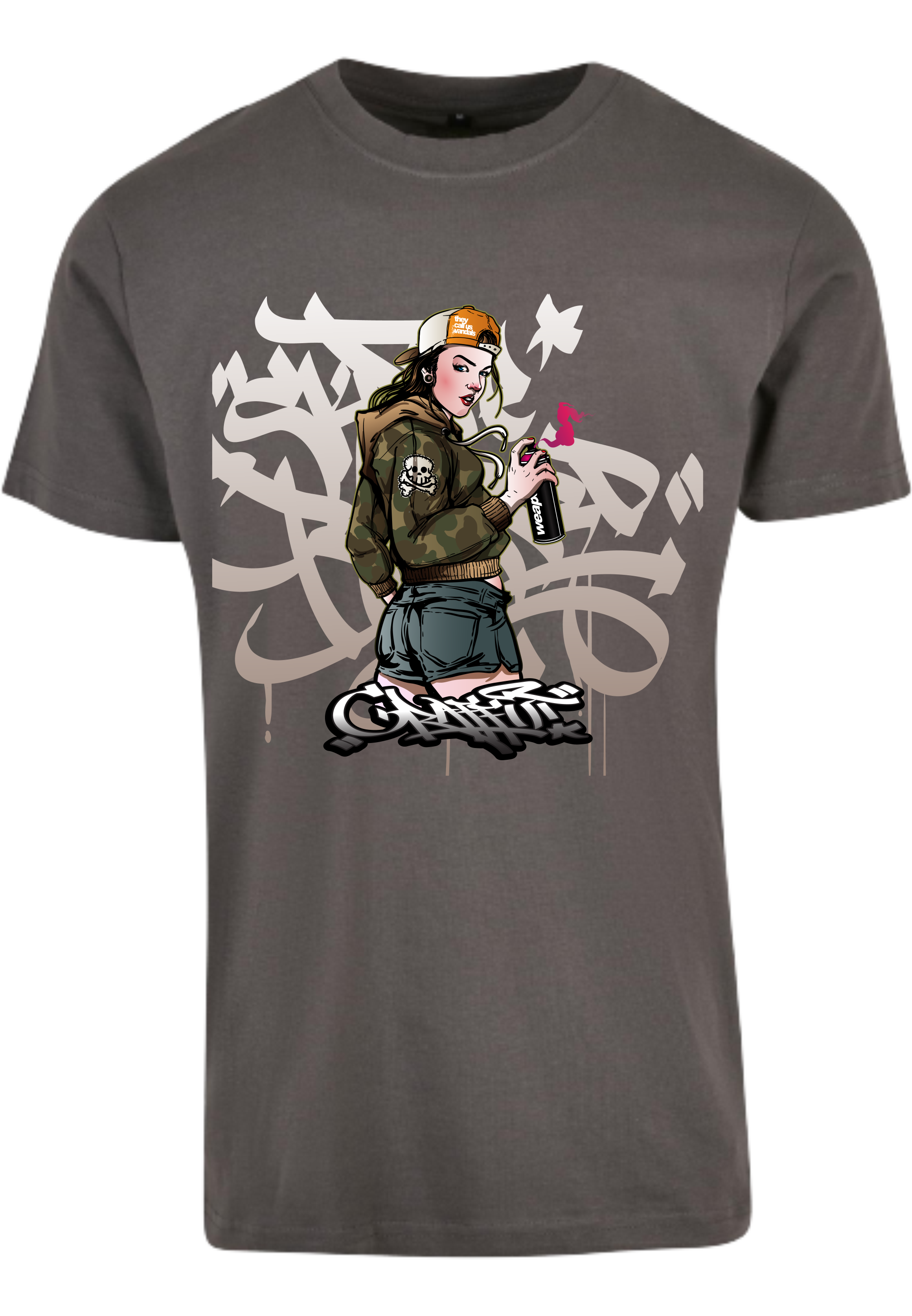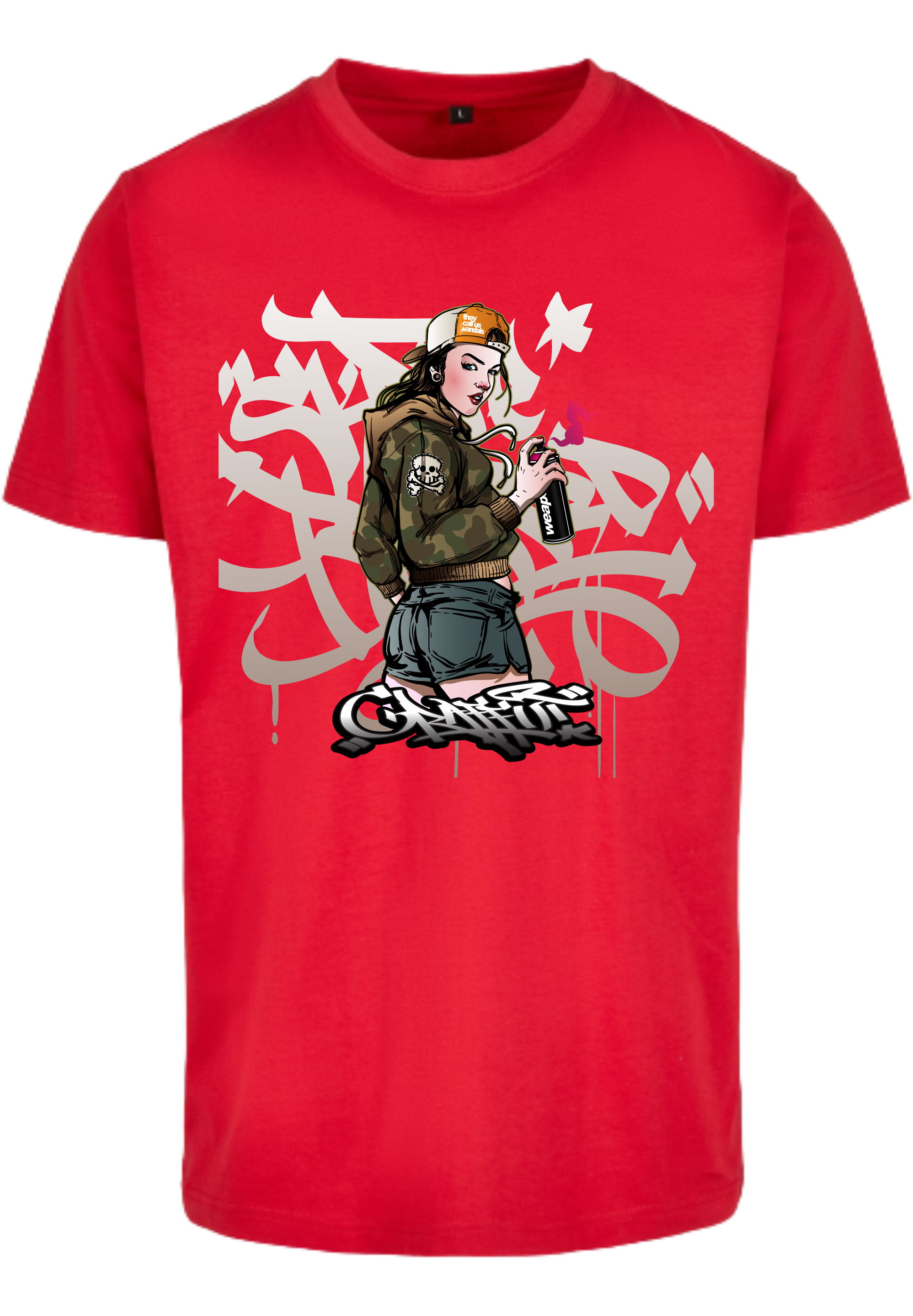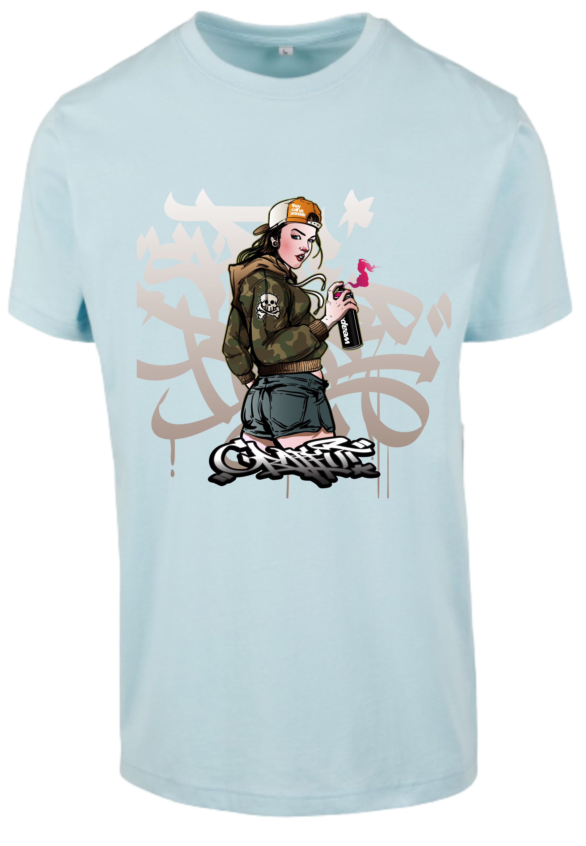 Einzigartiger Aufdruck: Das T-Shirt ist mit einem beeindruckenden Sprayerin-Aufdruck verziert, der die Kunst der Straßenmalerei und die kreative Energie urbaner Umgebungen widerspiegelt.