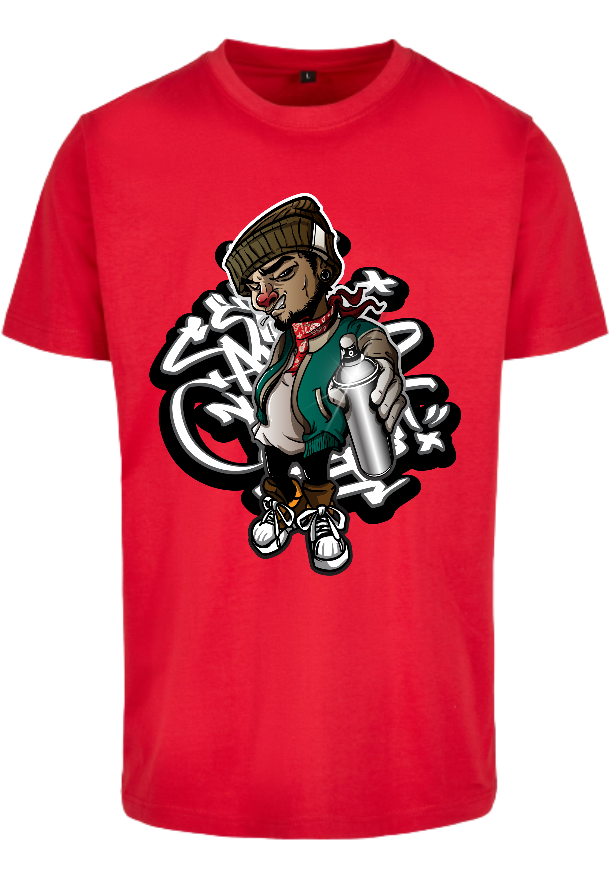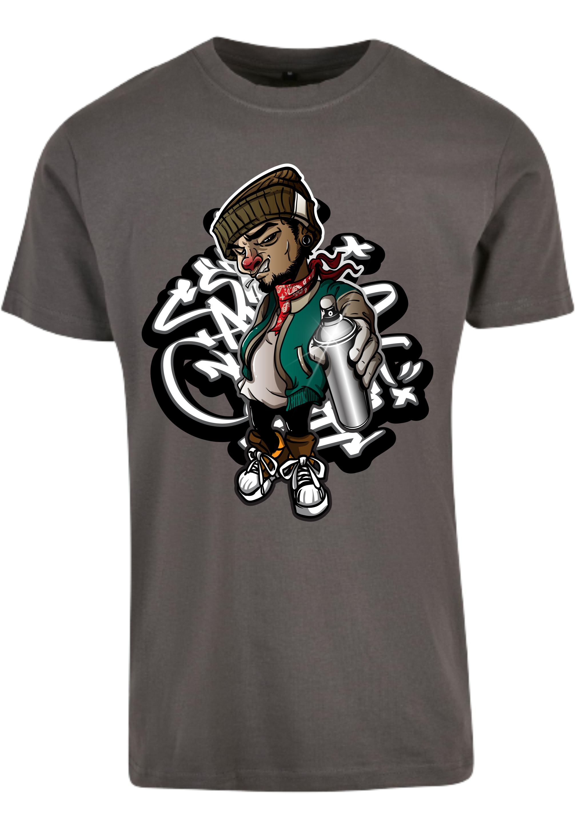 Einzigartiger Aufdruck: Das T-Shirt ist mit einem auffälligen Graffiti-Sprayer-Aufdruck verziert, der die Leidenschaft für Straßenkunst und kreativen Ausdruck widerspiegelt.