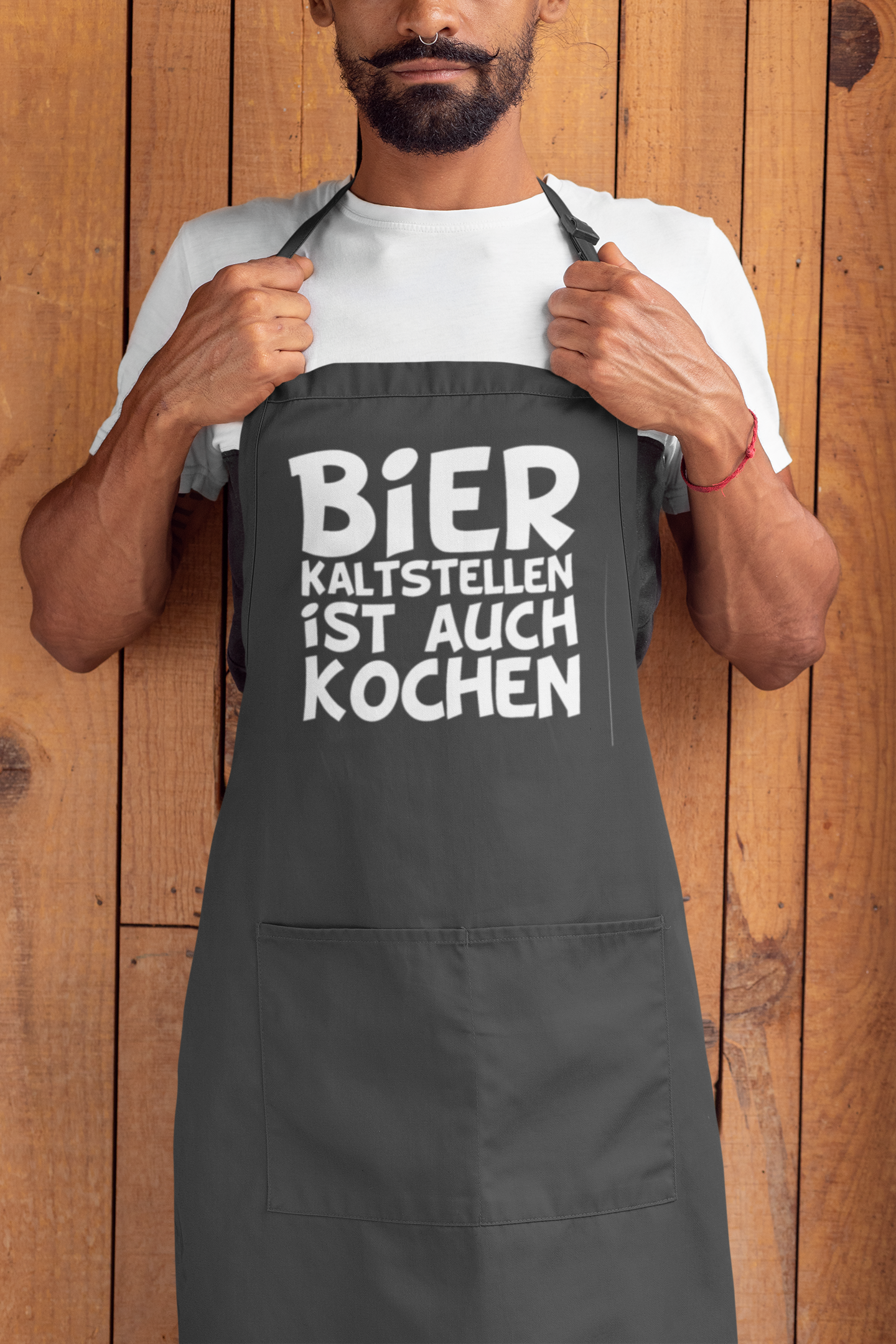 - Kochschürze mit dem humorvollen Aufdruck "Bier kaltstellen ist auch Kochen".