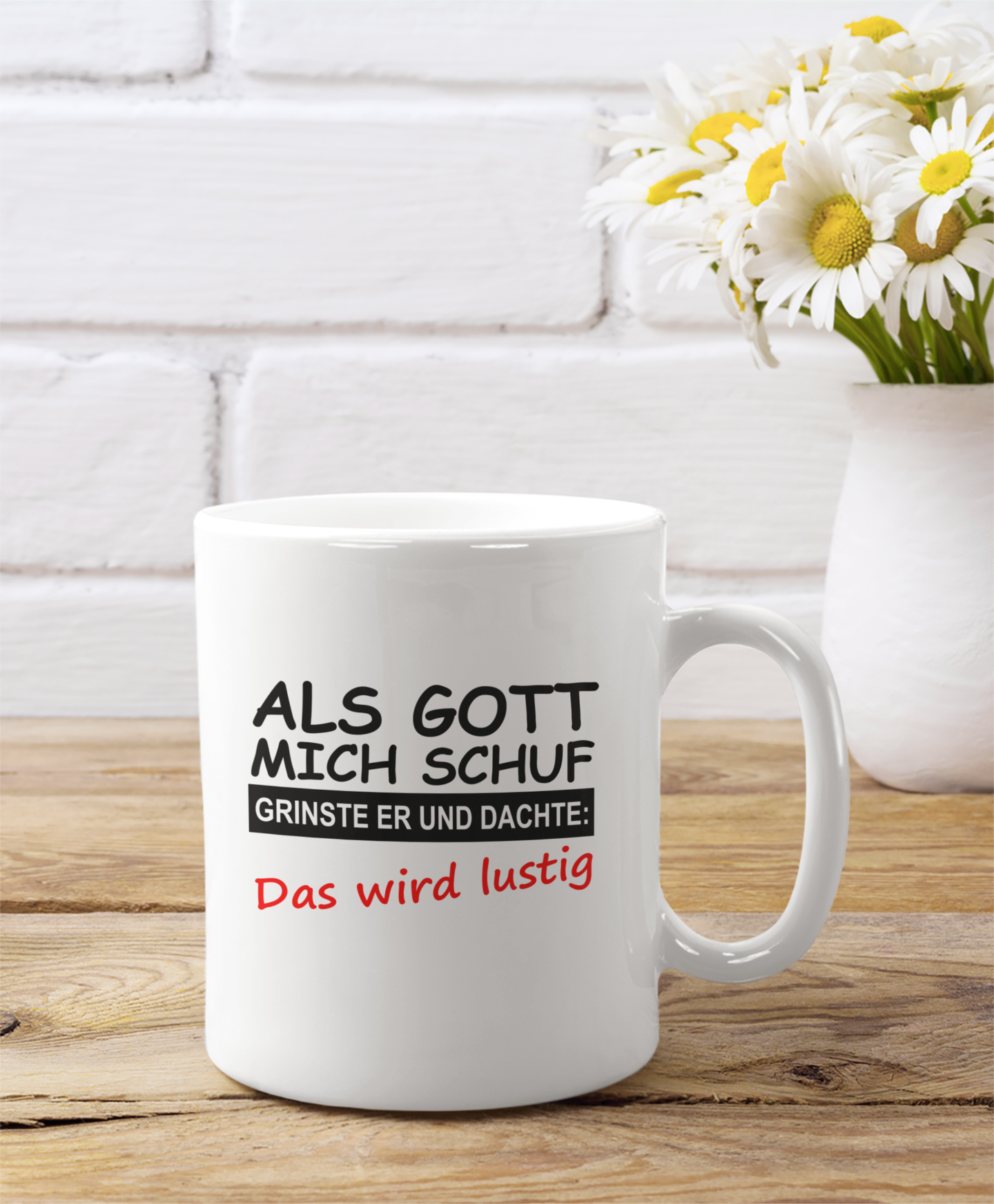 Witzige Tasse mit "Als Gott mich schuf, grinste er und dachte: Das wird lustig" Aufdruck. Hochwertige Keramik für heiß oder kalt Getränke. Ideales Geschenk für humorvolle Menschen. Bestellen Sie jetzt und starten Sie Ihren Tag mit einem Lächeln!